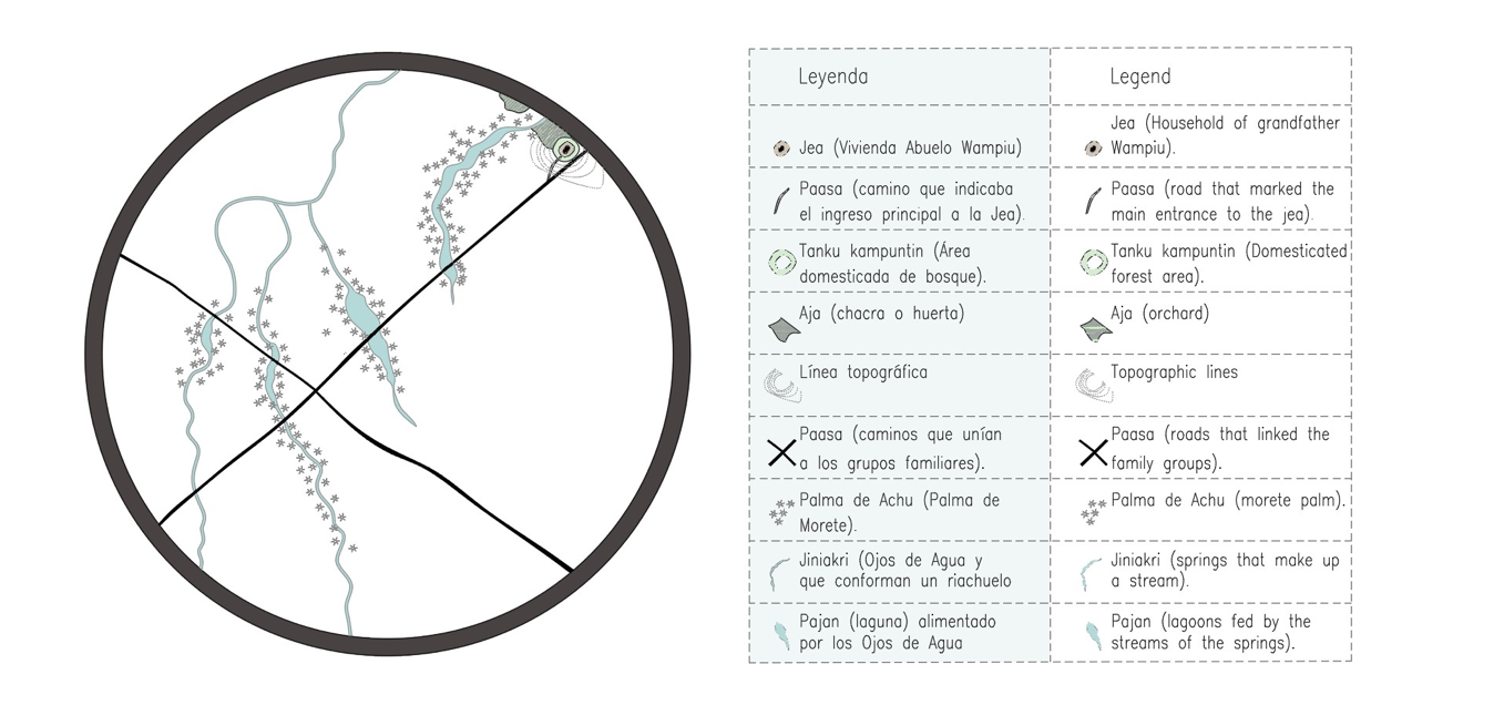 Figure 1. This first graphic translates the idea of planning a living space, from the principle of arantukma and wisdom: it marks the animal saladeros (mineral eating grounds) and water springs that stand out in the thick jungle, structuring the living system, which enables those who inhabit it to sustain themselves. Image courtesy of the author, 2022.
